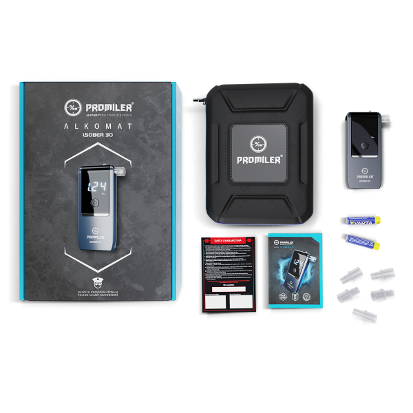 Decydując się na zakup alkomatu PROMILER iSOBER 30, inwestujesz nie tylko w zachowanie bezpieczeństwa na drodze. W zestawie oprócz samego urządzenia, znajdziesz również praktyczne, ochronne etui, wykonane z trwałego i wytrzymałego materiału, pozwalające na swobodny transport urządzenia. Ponadto zadbaliśmy o to, aby w zestawie znalazły się dodatkowe jednorazowe ustniki, przejrzysta instrukcja obsługi oraz dokument z podstawowymi informacjami, dotyczącymi serwisu, kalibracji i reklamacji urządzenia.
