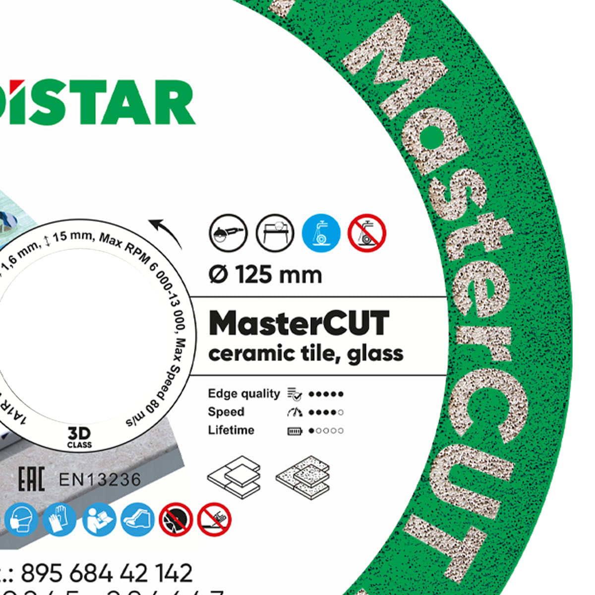 MasterCUT to tarcza, która szybko i sprawnie tnie płytki gresowe lub wytrzymałe materiały, takie jak szkło, w trybie na sucho na szlifierce kątowej lub chłodzone wodą na przecinarce do płytek. Osprzęt jest wytwarzany poprzez spiekanie wytrzymałych diamentów na wysokiej jakości stalowym korpusie. Komfort pracy uzyskuje się dzięki walcowaniu korpusu za pomocą specjalnej technologii. Żywotność tarczy w trybie na sucho wynosi 20-30 metrów bieżących i 30-40 metrów bieżących z chłodzeniem na wytrzymałym gresie o grubości 10 mm. Odpryski podczas cięcia są minimalne, cięcie prawie nie wymaga modyfikacji. MasterCUT - cięcie bez kompromisów.