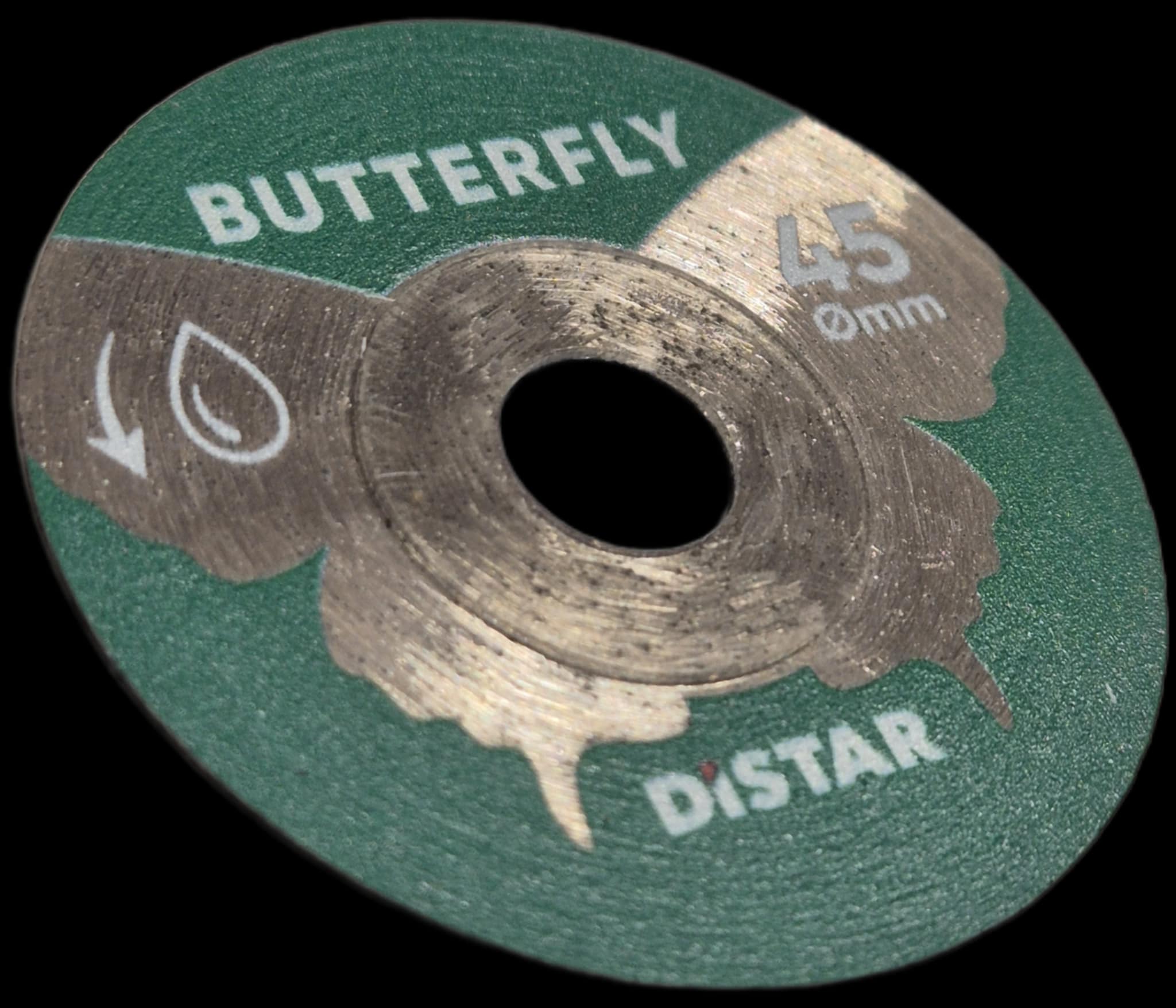 Dysk Butterfly ma unikalną konstrukcję i wiele zalet w porównaniu z dyskami galwanicznymi. Wykonany jest z jednolitej warstwy diamentowej o grubości 0,6 mm, co zapewnia minimalną szerokość cięcia i super czystą krawędź. Dzięki wysokiej sztywności dysk nie odchyla się podczas cięcia, a jednocześnie, dzięki średnicy 45 mm, jest bardzo zwrotny. Główną zaletą jednolitej warstwy diamentowej jest wysoka żywotność i stabilna wydajność przez cały okres użytkowania, czego nie oferują dyski galwaniczne.