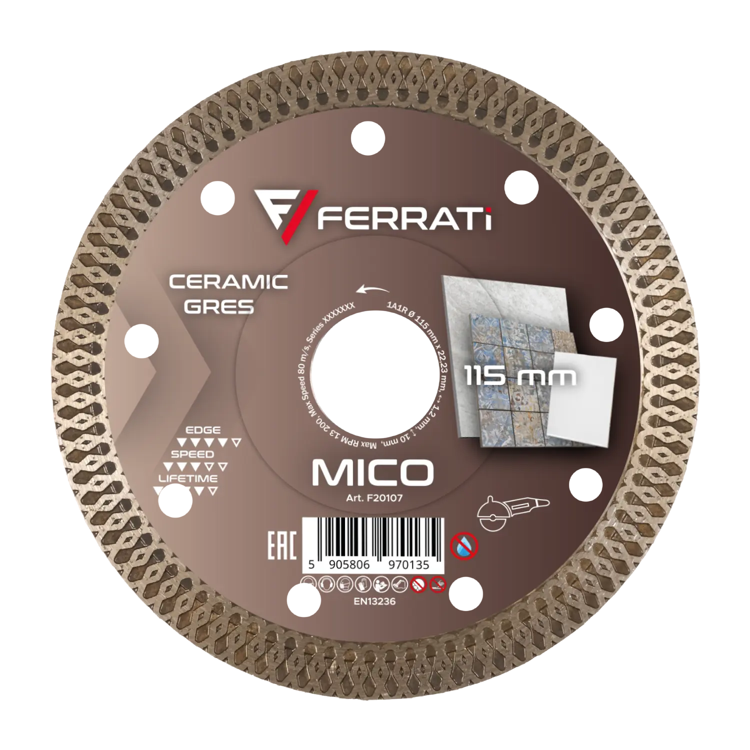 MICO bazuje na segmencie profilowanym nadającym jej lekkości w pracy i zręcznie łączącym skuteczność, jakość i niską cenę. Osiąga bardzo dobre rezultaty we wszystkich typach płytek ceramicznych i gresowych czyniąc ją podstawową w codziennej pracy. Doskonałe wykończenie pozwala osiągać bardzo dobry efekt czystego cięcia. Charakterystyczna konstrukcja segmentu minimalizuje opór i sprawnie wcina się w twardy materiał.