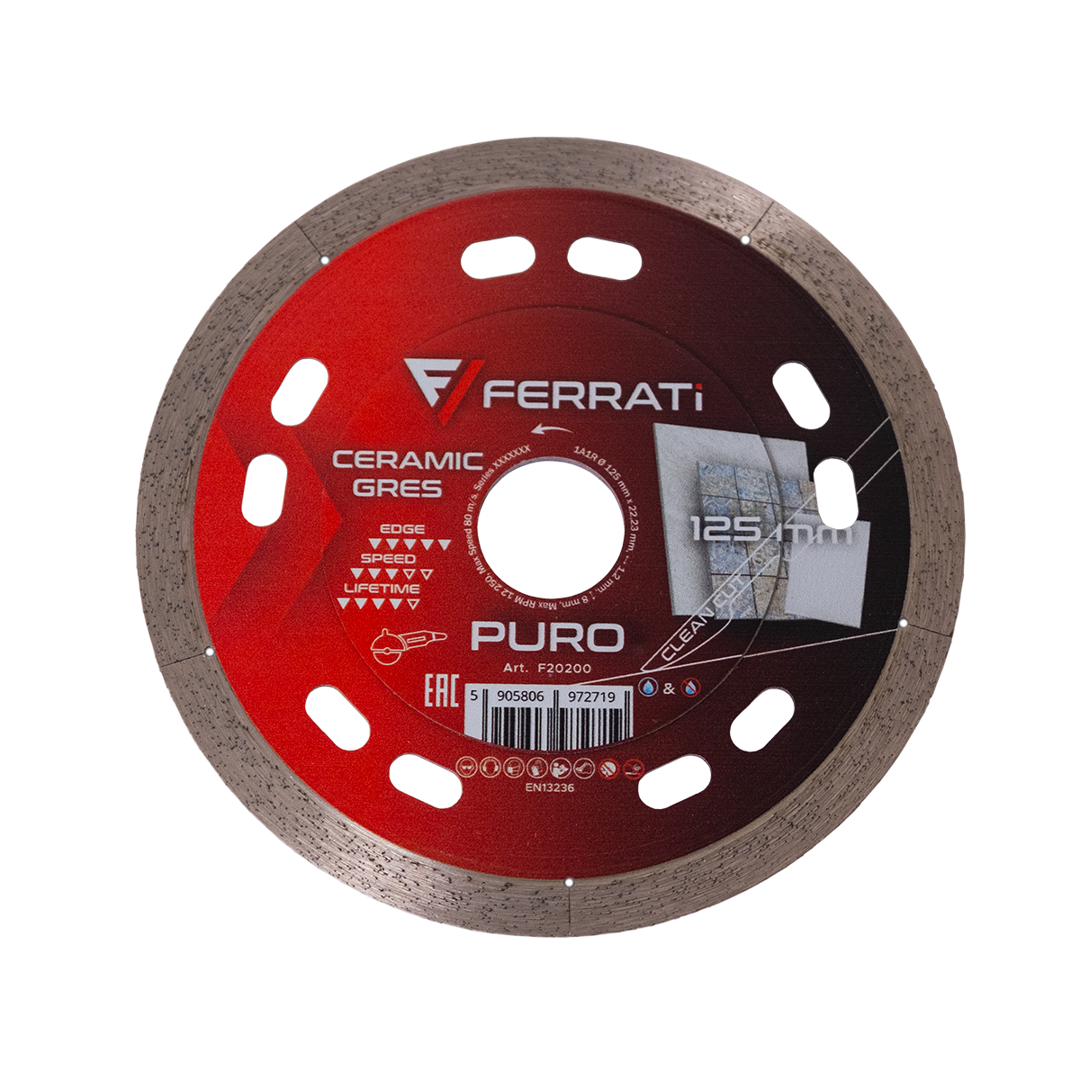 W oparciu o zdobyte doświadczenie i sugestie rzemieślników w obróbce powłok ceramicznych zaprojektowaliśmy z najwyższą starannością tarczę diamentową PURO. Synonim nieskazitelnie czystego cięcia i niezawodności. Dopracowana konstrukcja i starannie dobrana mieszanka diamentowa dała efekt najwyższej precyzji w obróbce. Ciągły segment, dzielony na pięć części o grubości 1,2mm oraz wzmacniany korpus dają efekt niezwykle odpornej tarczy do wymagających i średnio-długich oraz długich cięć (120cm-200cm). Cienki segment sprawnie wcina się w każdy wymagający materiał, a dzięki jego gładkiej strukturze mocno niweluje odpryski na szkliwie. Profesjonalna tarcza PURO do cięcia ceramiki, gresu, spieków kwarcowych do maksymalnej grubości 15mm.
