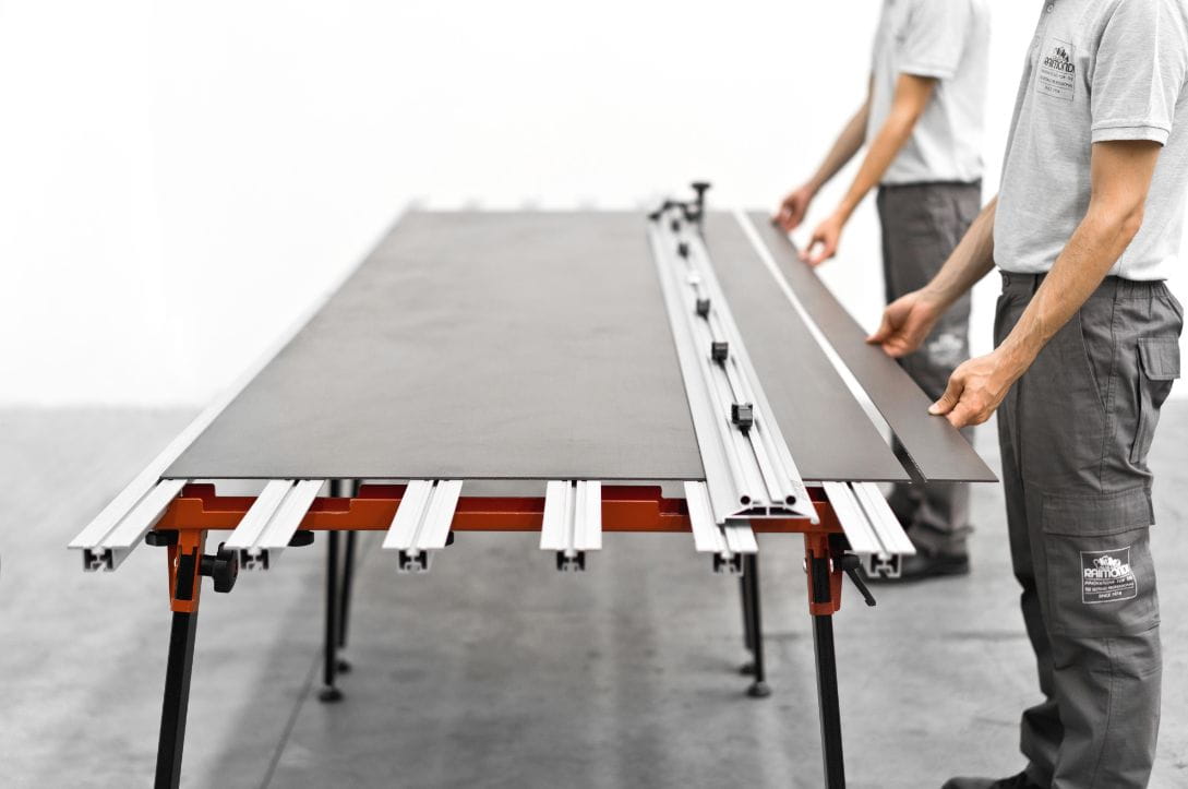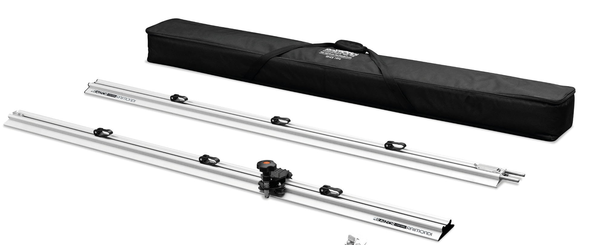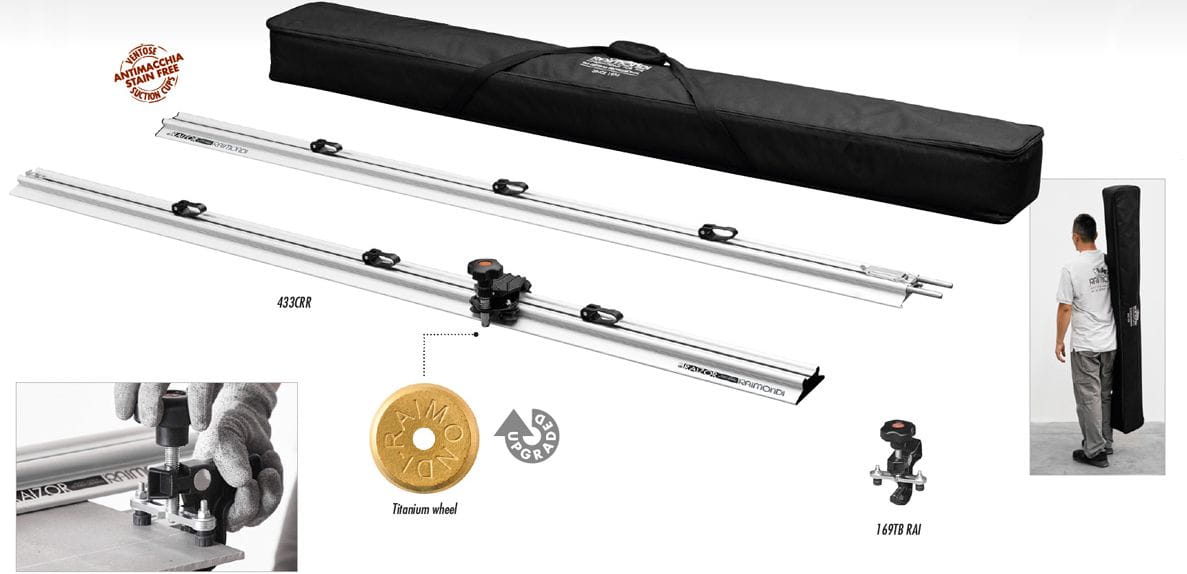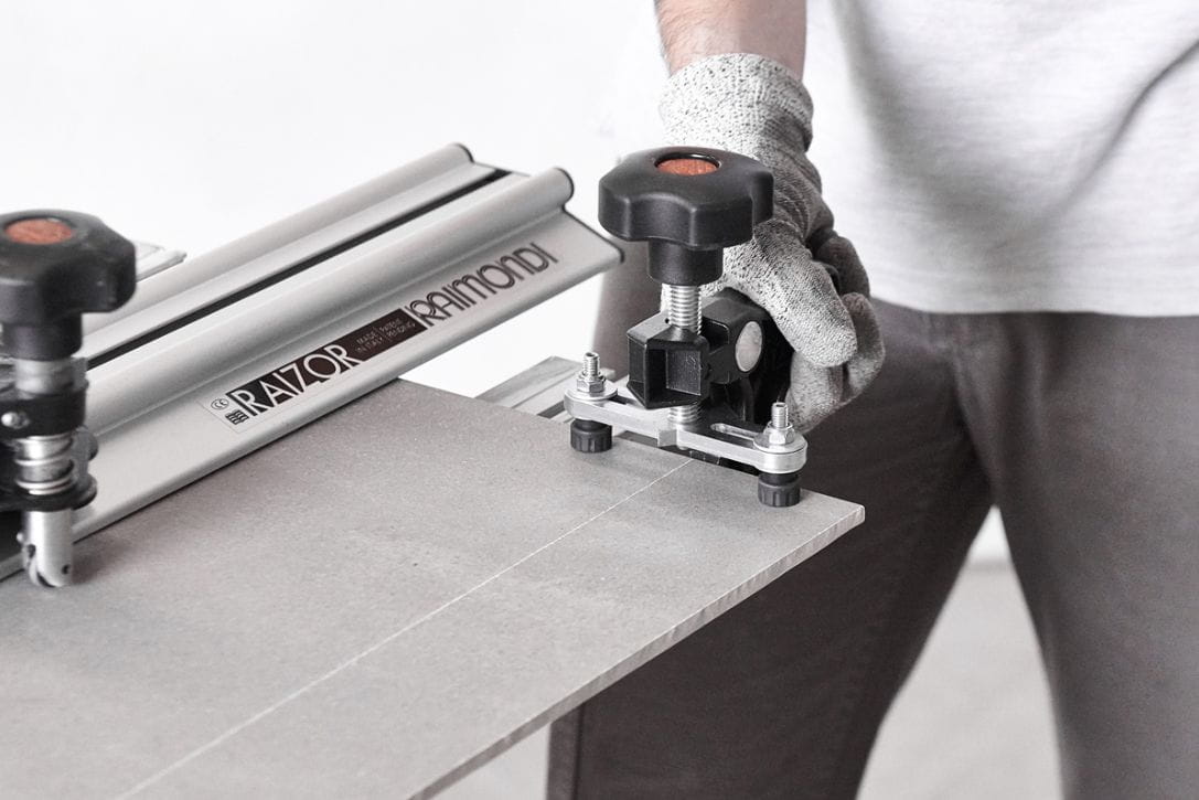 Możliwość założenia wózka do cięcia mechanicznego Raimondi POWER RAIZOR (wyposażenie dodatkowe), aby móc wykonywać cięcia (45°/90°/180°) z tarczą diamentową założoną na szlifierką kątową