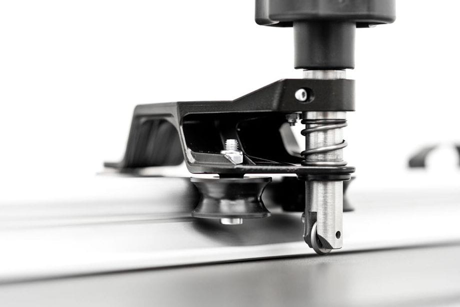 Wózek tnący, jest wykonany z odlewanego ciśnieniowo aluminium i przesuwa się na prowadnicach, dzięki 3 kołom polioksymetylenowym (materiał odporny na ścieranie); każdy wyposażony w dwa łożyska wewnętrzne