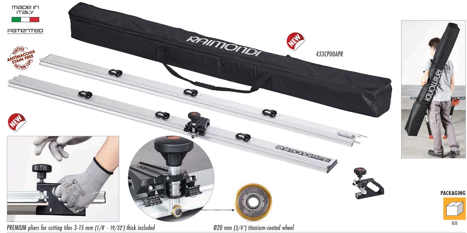 • System do cięcia płytek wielkoformatowych do 336 cm (451 cm z opcjonalnym przedłużeniem), lekki (5,4 kg) i łatwy w transporcie.