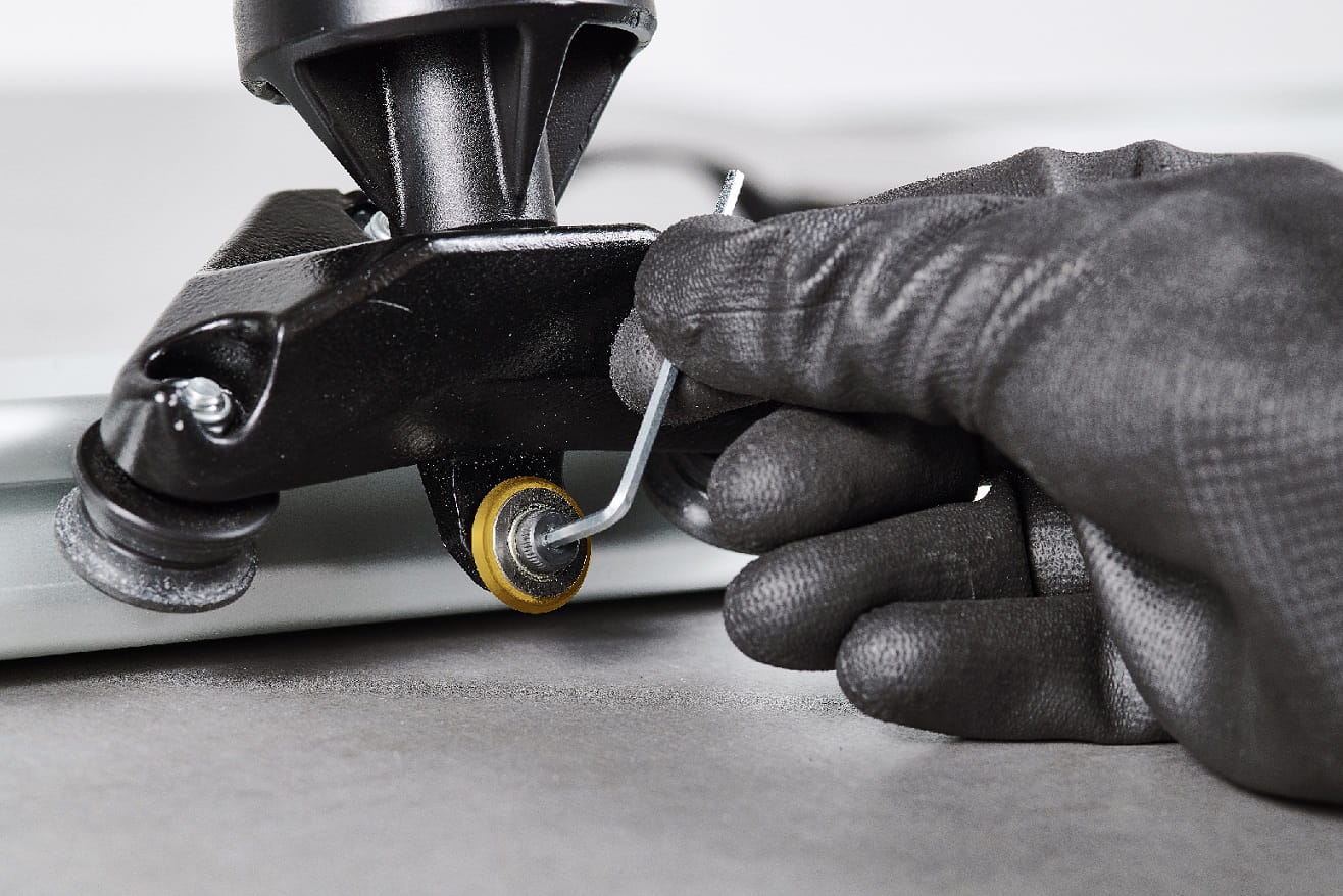 - Wózek tnący wykonany z ciśnieniowo odlewanego aluminium, wyposażony w tytanowe kółko Ø 20 mm, kółko ze zintegrowanym łożyskiem i kalibrowaną