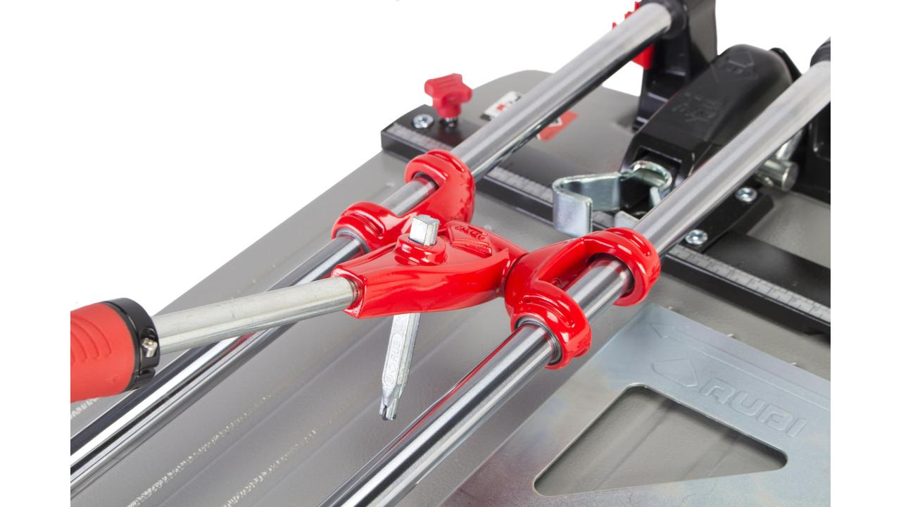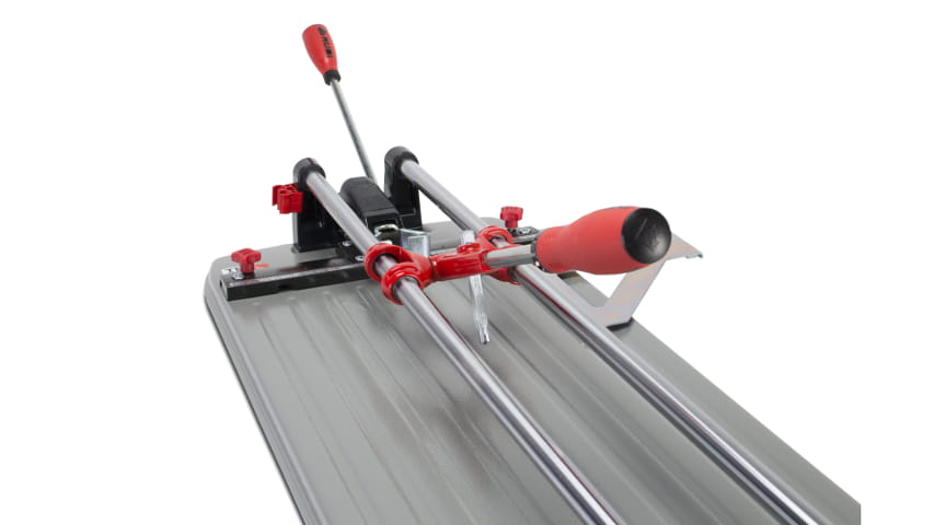 Uchwyt drążka w przecinarce TS-MAX jest wykonany z podwójnego materiału, ponadto ma ergonomiczny kształt, co zapewnia wygodę użytkowania. Ponadto wszystkie przecinarki są wyposażone w duży przymiar boczny ułatwiający lepsze pozycjonowanie płytek oraz większą precyzję cięć seryjnych.