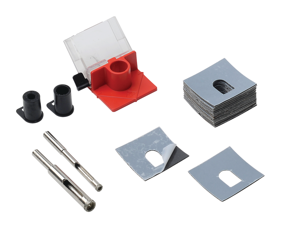 - Dwustronne przylepce umożliwiają łatwe mocowanie prowadnicy Easy Gres na dowolnej powierzchni, w której ma być wykonany otwór.