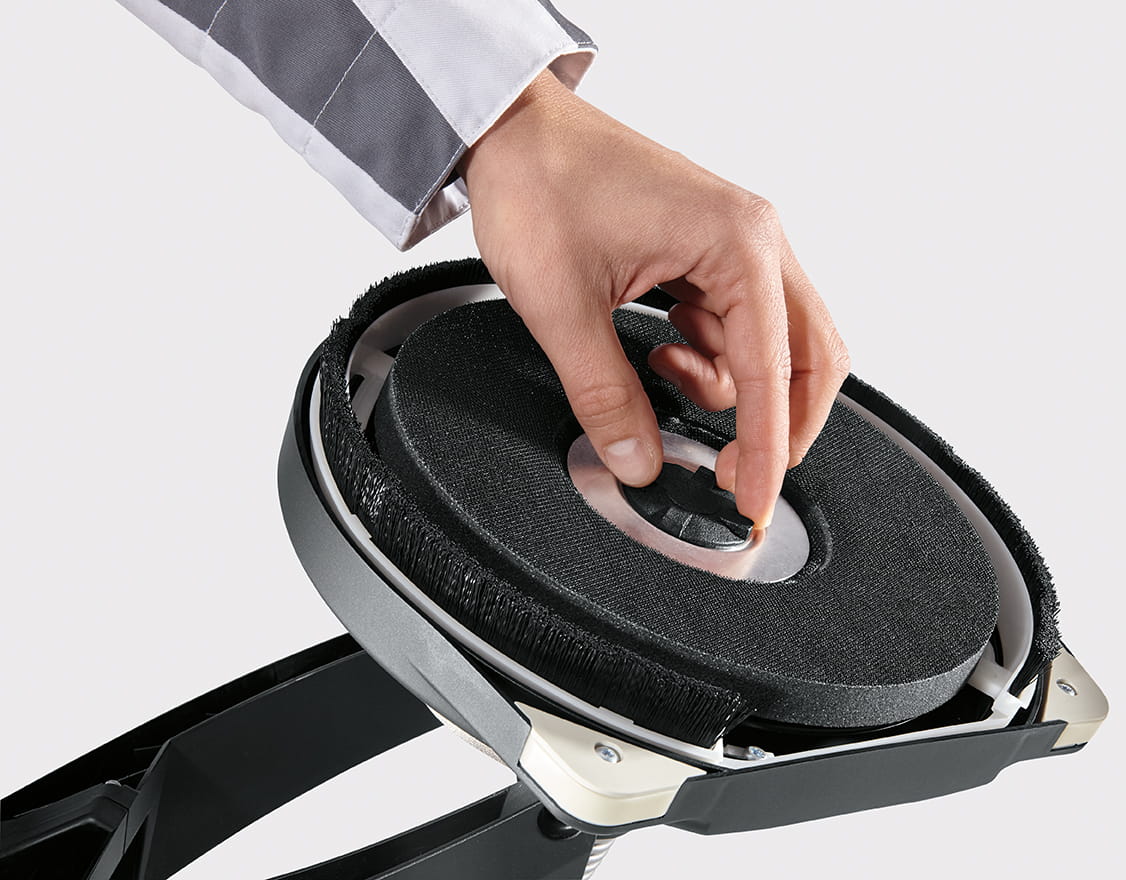 Osłona przeciwpyłowa z obrzeżem szczotkowym. Resorowane obrzeże szczotkowe zapobiega powstawaniu rowków i zadrapań podczas pracy i zapewnia optymalne odsysanie pyłów.